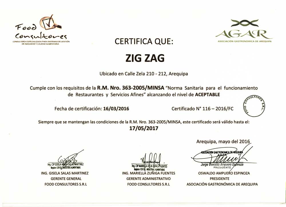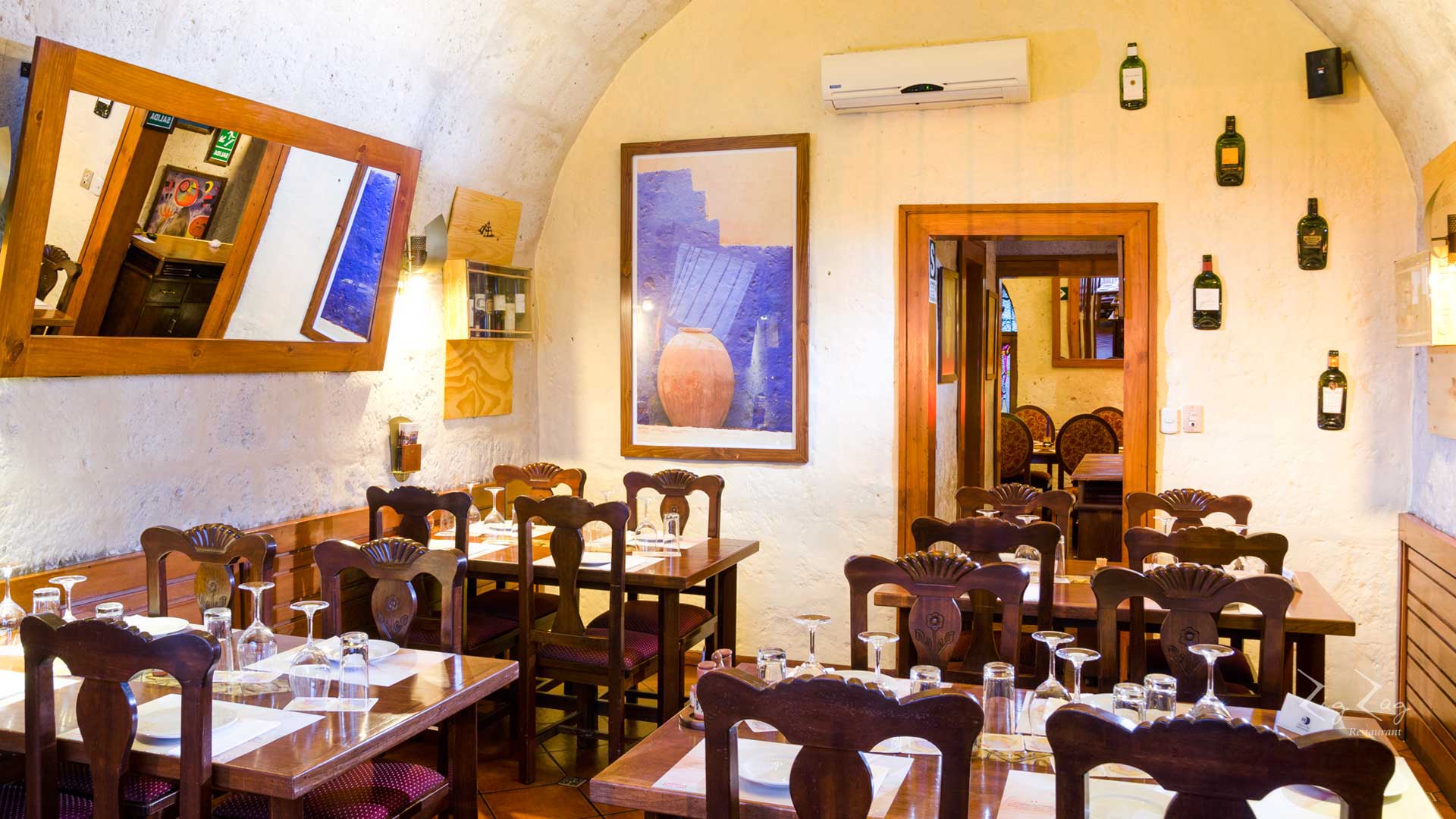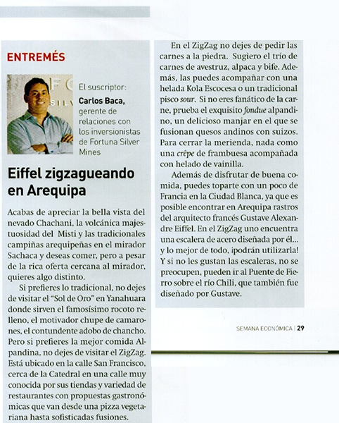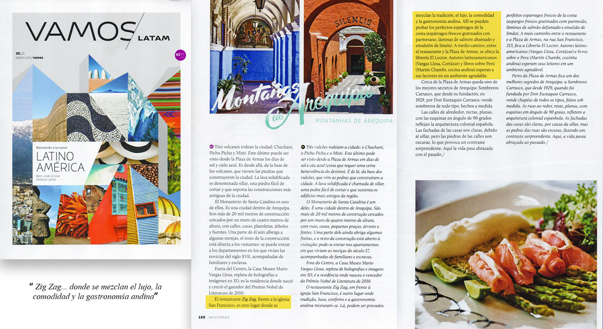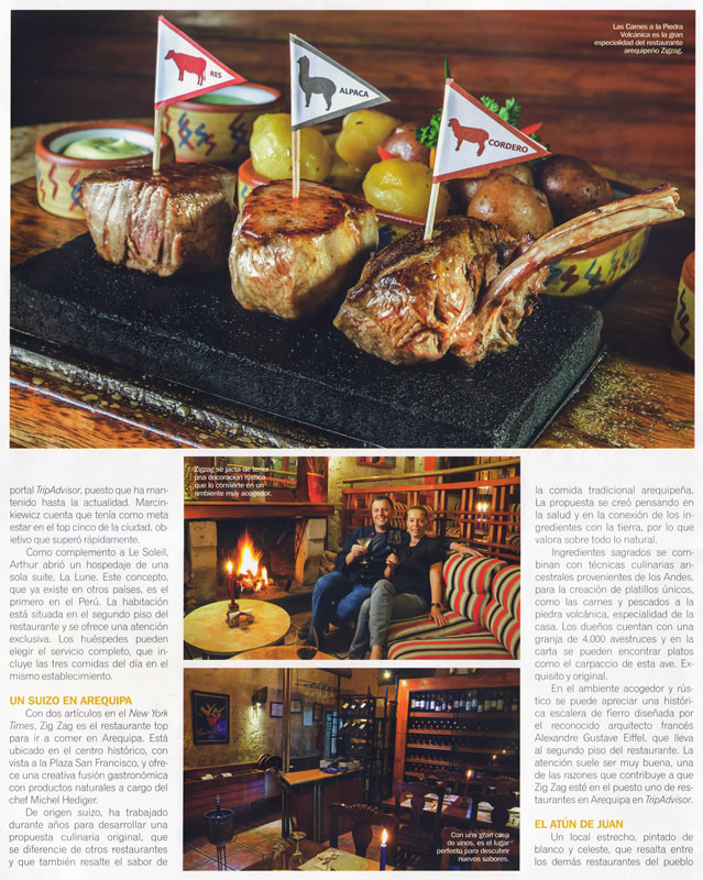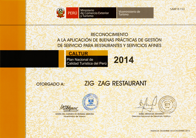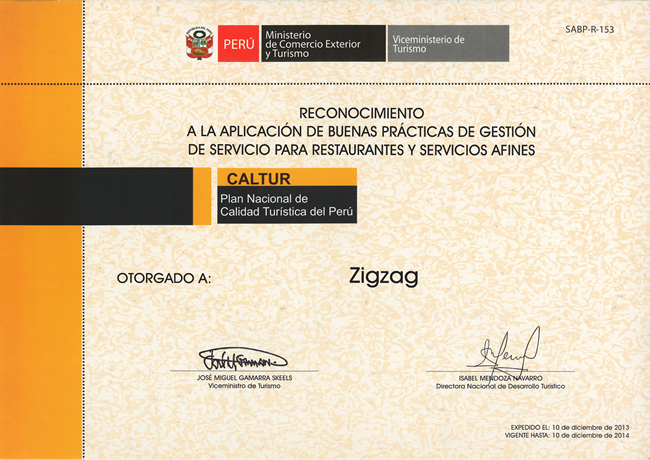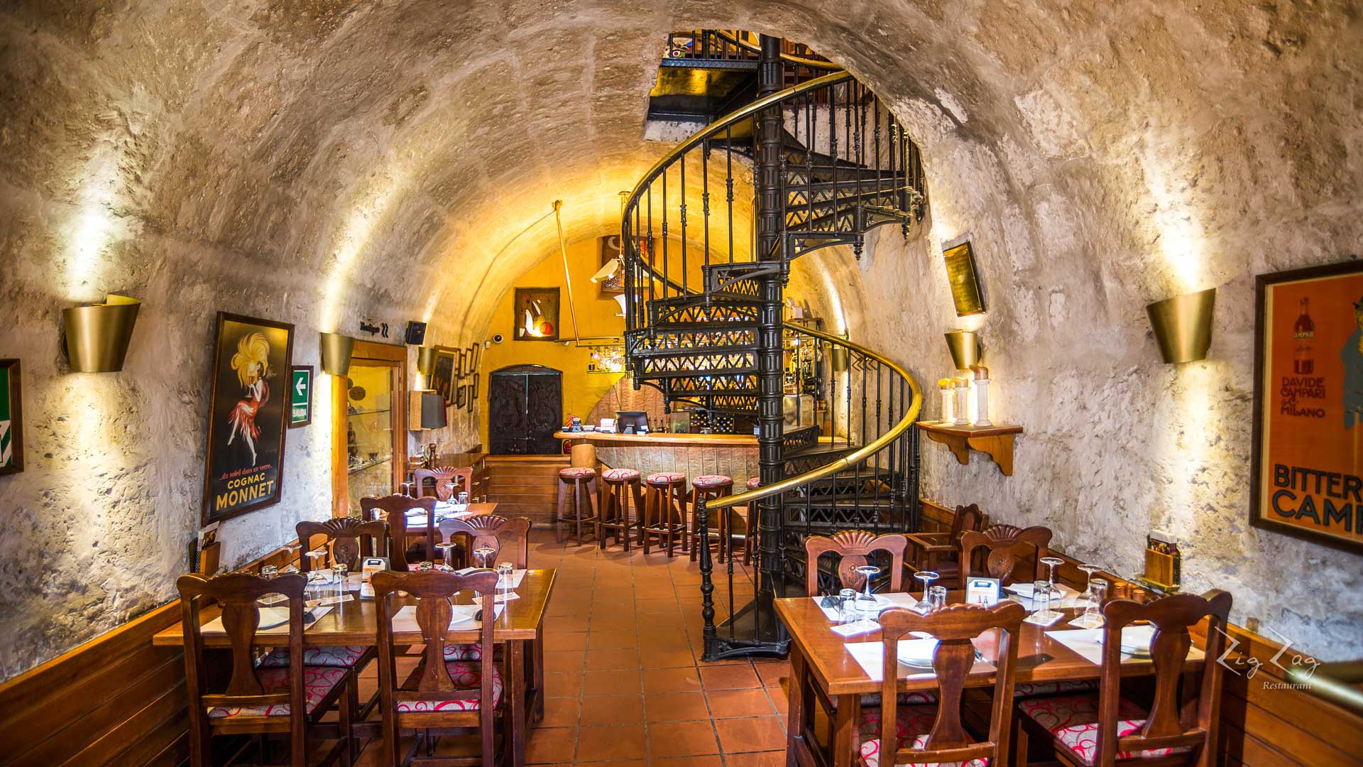 Ubicado en el centro histórico y frente a la bella Plaza San Francisco, Zig Zag Restaurant es un lugar especial para descubrir nuevos vinos en nuestro vino bar y disfrutar de una noche gastronómica diferente en un ambiente acogedor, admirando nuestra histórica escalera de fierro diseñada por el famoso arquitecto francés Gustave Alexandre Eiffel.