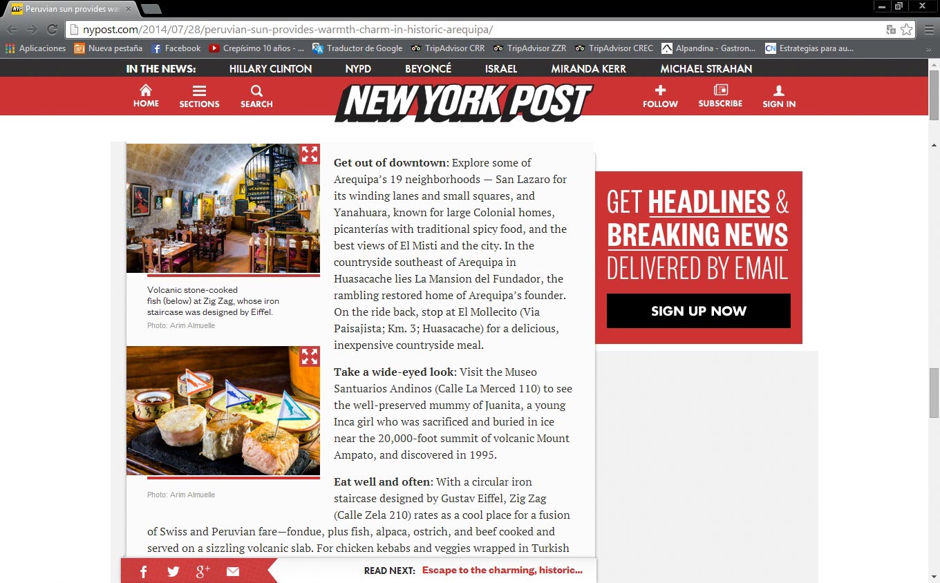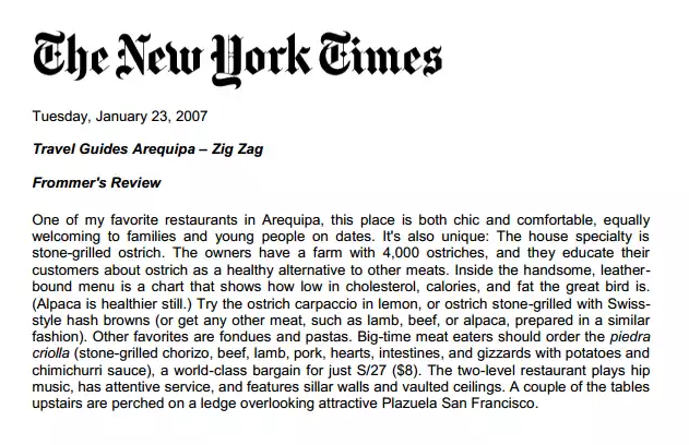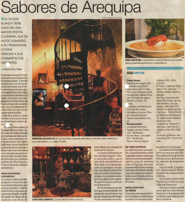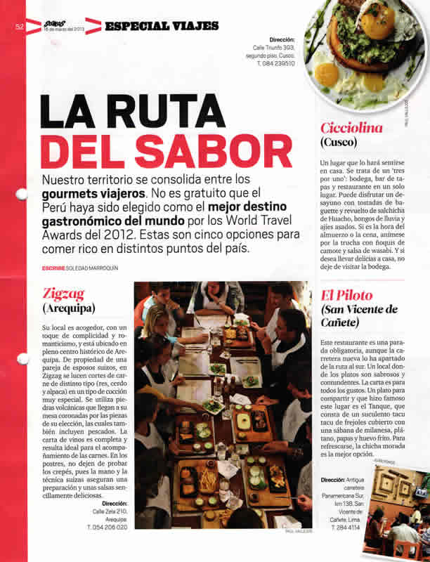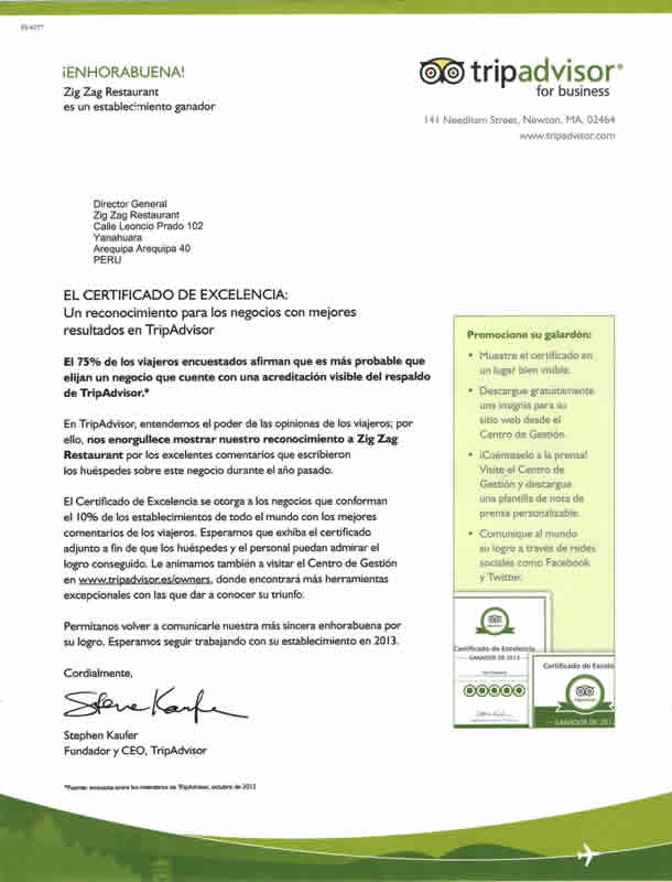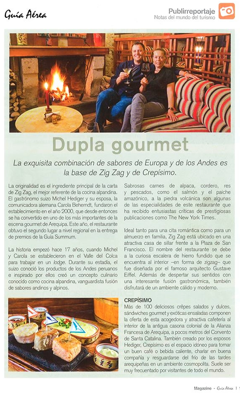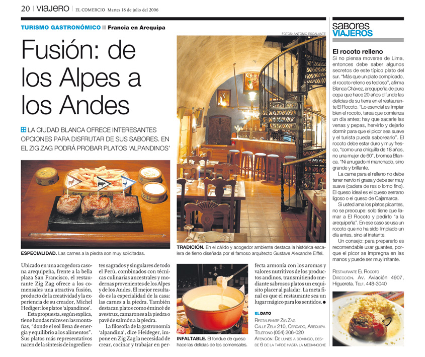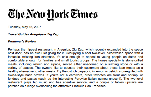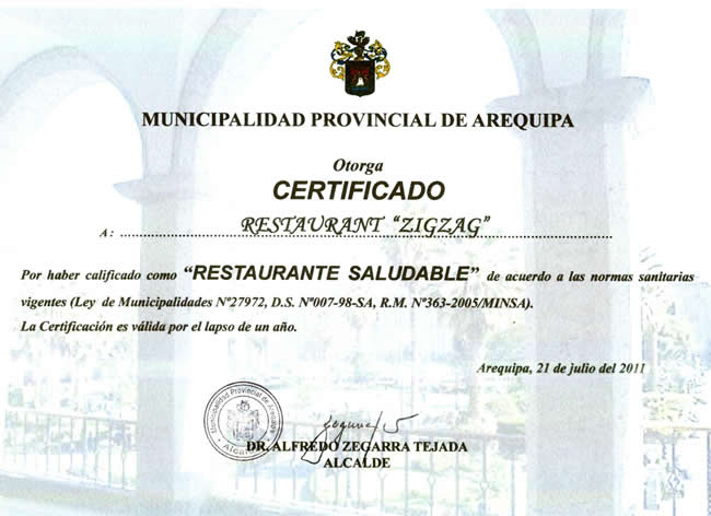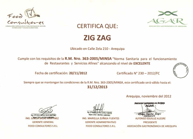 Ubicado en el centro histórico y frente a la bella Plaza San Francisco, Zig Zag Restaurant es un lugar especial para descubrir nuevos vinos en nuestro vino bar y disfrutar de una noche gastronómica diferente en un ambiente acogedor, admirando nuestra histórica escalera de fierro diseñada por el famoso arquitecto francés Gustave Alexandre Eiffel.